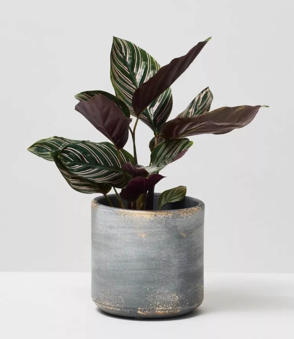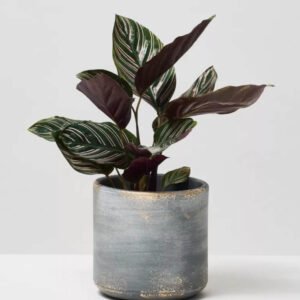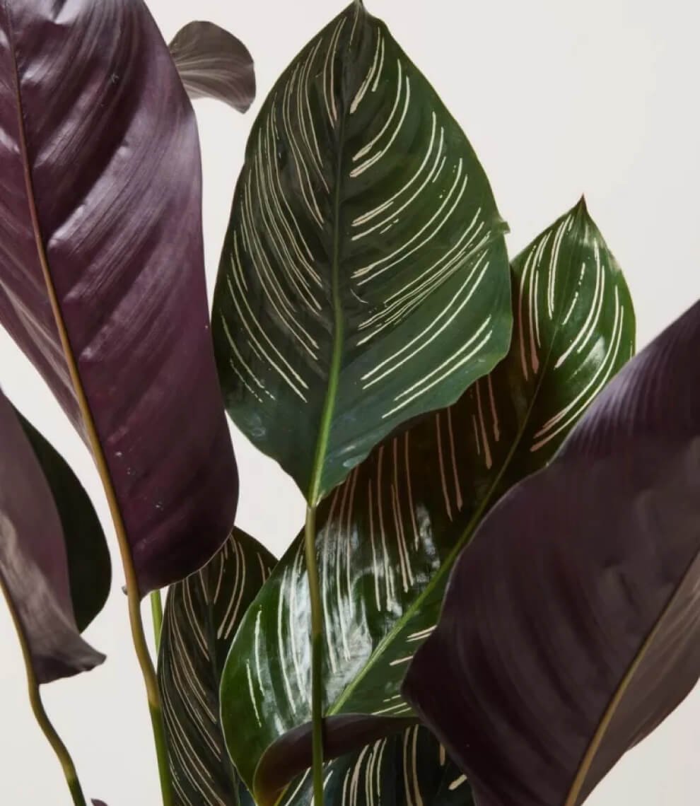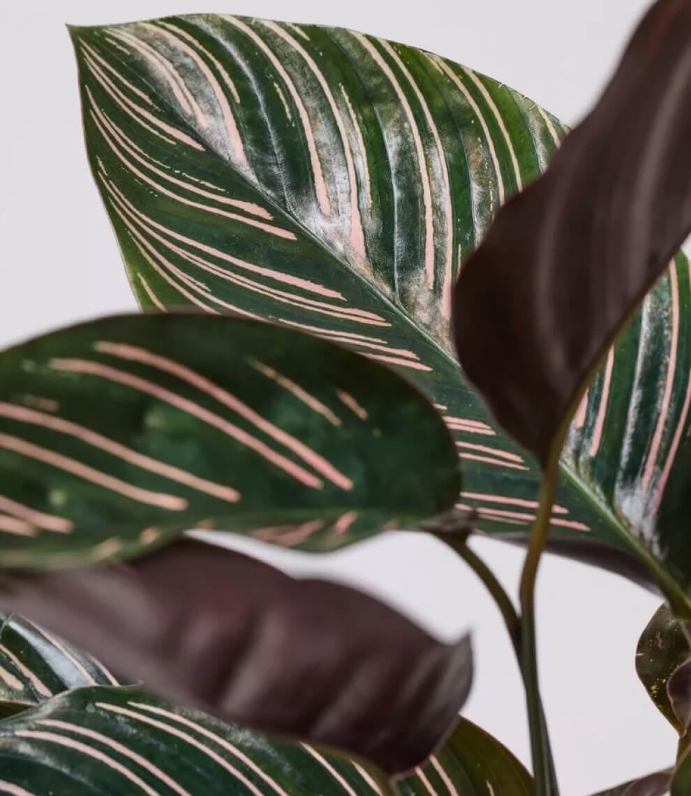 Calathea Pin Stripe or Calathea Ornata are tropical plants with pink pinstripes decorating their large waxy deep green and maroon coloured leaves, which beautifully dance according to the circadian rhythm.